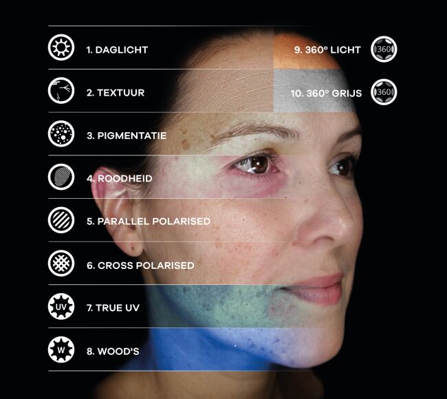 De OBSERV 520 brengt met 8 of 10 analysemodi en 5 gezichtsposities alle huidkenmerken in 8 seconden haarscherp in beeld. Deze 5 posities zorgen voor een overzichtelijk en volledig huidbeeld die zelfs de kleinste details en huidverbeteringen met een ongeƫvenaarde helderheid zichtbaar maken.